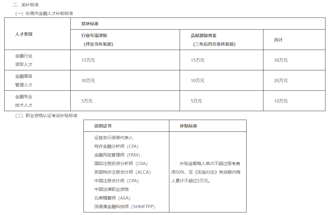 近日,東莞市金融工作局印發(fā)《東莞市加強(qiáng)金融人才隊(duì)伍建設(shè)的實(shí)施辦法(試行)試行》有關(guān)獎(jiǎng)補(bǔ)資金申報(bào)指南(2023年)。文件中英國特許注冊會計(jì)師(acca)被列入職業(yè)資格認(rèn)證考試補(bǔ)貼。補(bǔ)貼金額每人單次不超過報(bào)考費(fèi)用50%,在《實(shí)施辦法》有效期內(nèi)每人累計(jì)不超過5萬元。具體通知內(nèi)容如下: