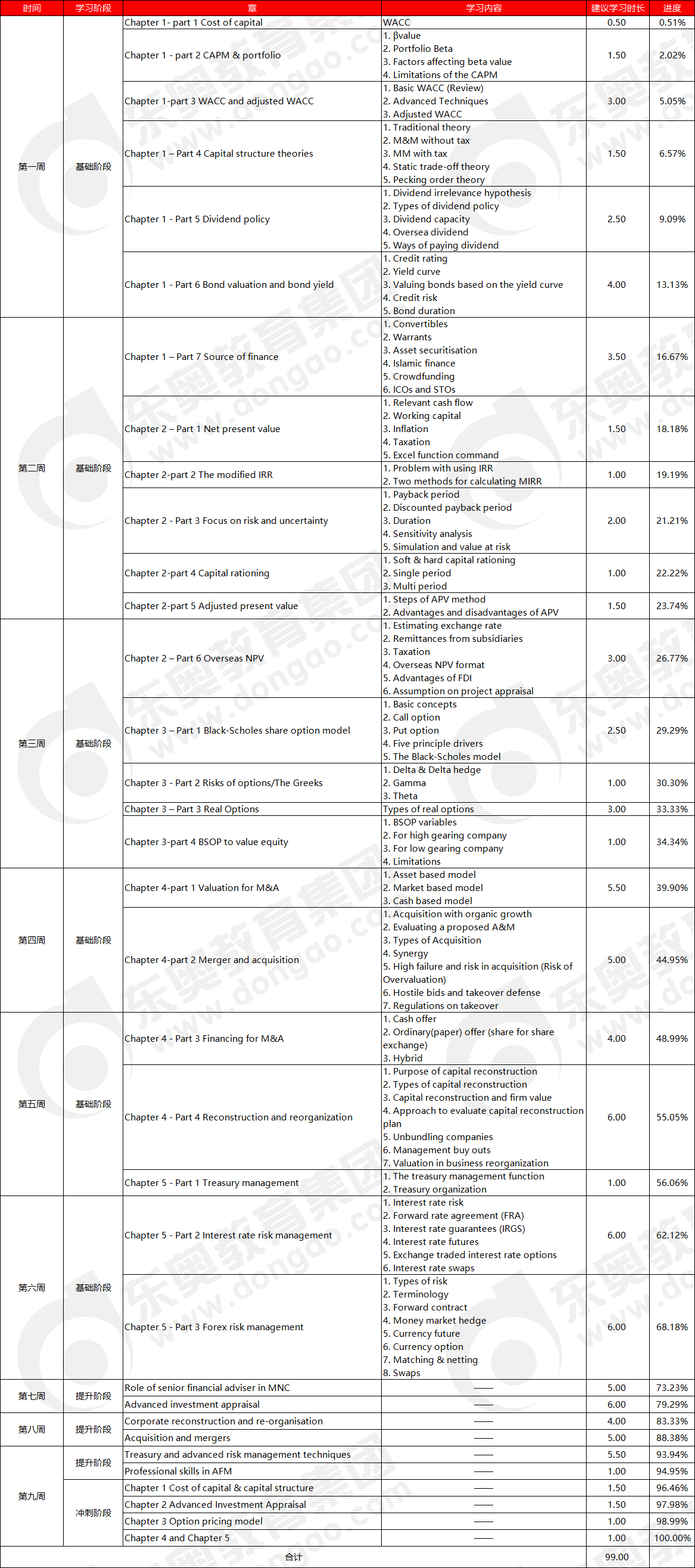 沉醉于知識的海洋,讓學習成為一種享受。accaAFM是指《高級財務(wù)管理》這一門科目,是選修模塊的科目之一,科目涵蓋的內(nèi)容包括高級投資評估,公司并購、重組;高級風險管理;跨國公司面臨的經(jīng)濟環(huán)境等。今天為同學們整理了AFM科目學習計劃表,準備參加考試的同學們來看看吧。