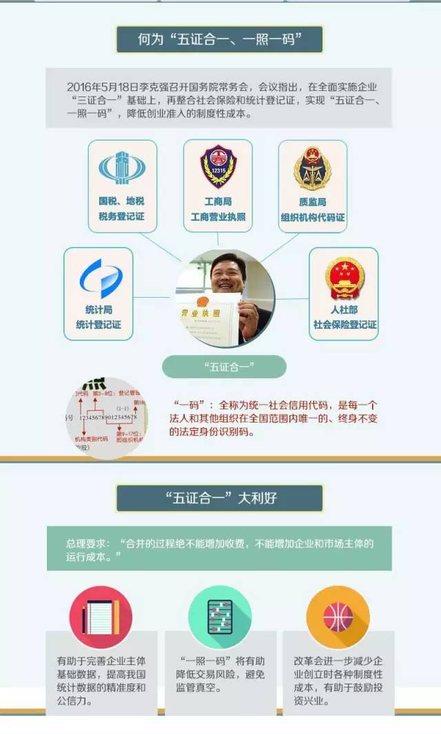 通知決定,在全面實施工商營業(yè)執(zhí)照、組織機構(gòu)代碼證、稅務(wù)登記證“三證合一”登記制度改革的基礎(chǔ)上,再整合社會保險登記證和統(tǒng)計登記證。從2016年10月1日起正式實施“五證合一、一照一碼”,在更大范圍、更深層次實現(xiàn)信息共享和業(yè)務(wù)協(xié)同,鞏固和擴大“三證合一”登記制度改革成果,進一步為企業(yè)開辦和成長提供便利化服務(wù),降低創(chuàng)業(yè)準入的制度性成本,優(yōu)化營商環(huán)境,激發(fā)企業(yè)活力,推進大眾創(chuàng)業(yè)、萬眾創(chuàng)新,促進就業(yè)增加和經(jīng)濟社會持續(xù)健康發(fā)展。