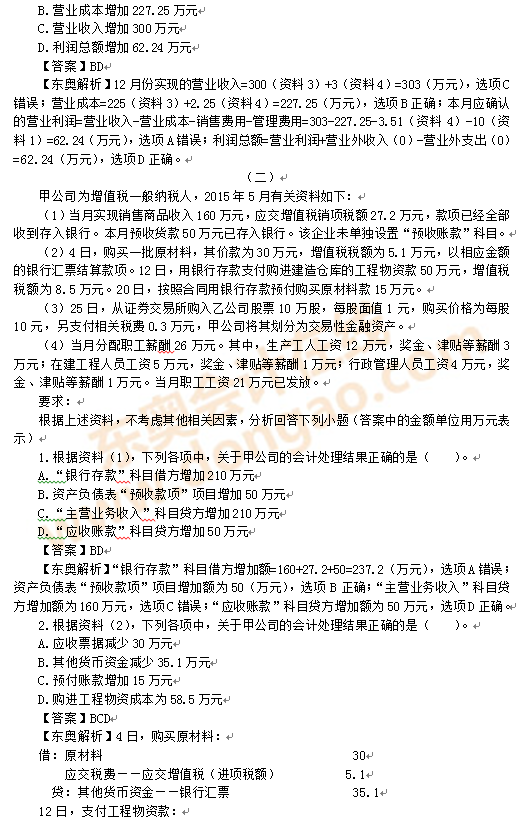 【東奧解析】12月份實(shí)現(xiàn)的營(yíng)業(yè)收入=300(資料3)+3(資料4)=303(萬元),選項(xiàng)C錯(cuò)誤;營(yíng)業(yè)成本=225(資料3)+2.25(資料4)=227.25(萬元),選項(xiàng)B正確;本月應(yīng)確認(rèn)的營(yíng)業(yè)利潤(rùn)=營(yíng)業(yè)收入-營(yíng)業(yè)成本-銷售費(fèi)用-管理費(fèi)用=303-227.25-3.51(資料4)-10(資料1)=62.24(萬元),選項(xiàng)A錯(cuò)誤;利潤(rùn)總額=營(yíng)業(yè)利潤(rùn)+營(yíng)業(yè)外收入(0)-營(yíng)業(yè)外支出(0)=62.24(萬元),選項(xiàng)D正確。