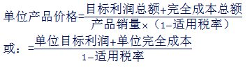 目標(biāo)利潤定價法是根據(jù)預(yù)期目標(biāo)利潤和產(chǎn)品銷售量、產(chǎn)品成本、適用稅率等因素來確定產(chǎn)品銷售價格的方法。其計算公式為: