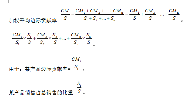 所以:加權平均邊際貢獻率=∑(各產(chǎn)品邊際貢獻率×各產(chǎn)品占總銷售比重)