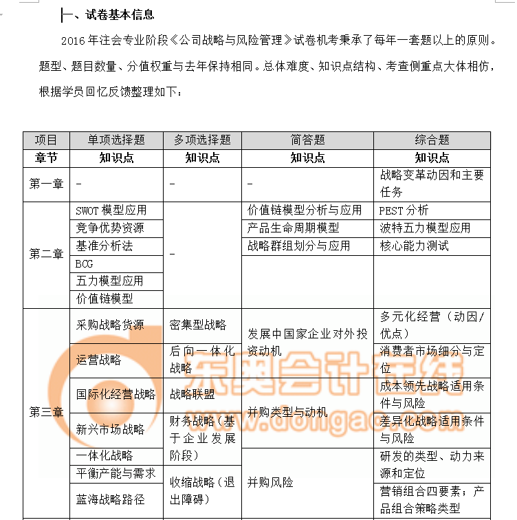 2016年注會專業(yè)階段《公司戰(zhàn)略與風險管理》考試總的來說難度不小,一改近三年來的出題風格,是開啟今后一段時期新的考查風格的具有里程碑標志意義的試卷,有很強的現(xiàn)實借鑒意義。作為2017年該科復習備考系列文章之一,下面對2016年《公司戰(zhàn)略與風險管理》試卷進行詳細解讀。