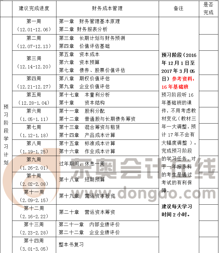 領(lǐng)先別人一步,取證從現(xiàn)在開始!下面東奧為大家制定了注冊會計師考試《財務成本管理》學習計劃,希望大家根據(jù)自己的情況,有計劃的去復習,逐步實現(xiàn)自己的目標。