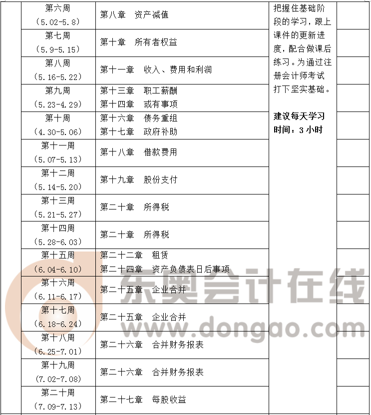 2017年注冊會計師考試綜合階段考試科目為:《職業(yè)能力綜合測試(試卷一)》、《職業(yè)能力綜合測試(試卷二)》,為幫助同學(xué)們順利完成今年的注冊會計師綜合階段學(xué)習(xí),東奧制定了這份學(xué)習(xí)計劃表,以方便同學(xué)們對綜合階段預(yù)習(xí)進度進行全面控制,達(dá)到較好的學(xué)習(xí)效果。希望大家根據(jù)自己的情況,有計劃的去復(fù)習(xí),逐步實現(xiàn)自己的目標(biāo)。