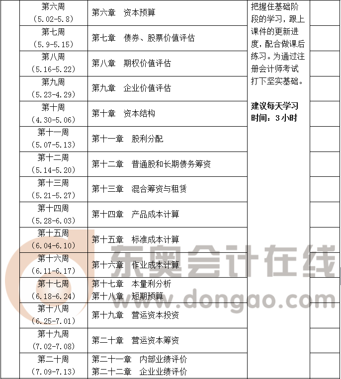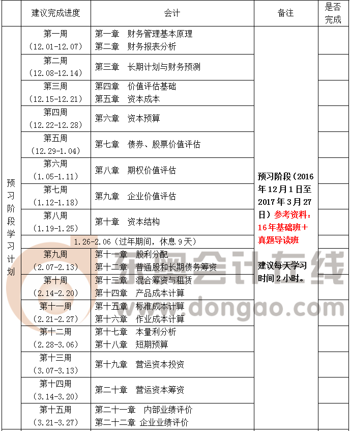 2017年注冊會計師考試綜合階段考試科目為:《職業(yè)能力綜合測試(試卷一)》、《職業(yè)能力綜合測試(試卷二)》,為幫助同學們順利完成今年的注冊會計師綜合階段學習,東奧制定了這份學習計劃表,以方便同學們對綜合階段預習進度進行全面控制,達到較好的學習效果。希望大家根據(jù)自己的情況,有計劃的去復習,逐步實現(xiàn)自己的目標。