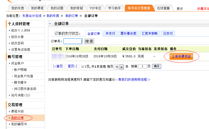 3.在賬號和交易管理里面,點擊我的訂單,可以看到上傳開課憑證按鈕如圖3所示