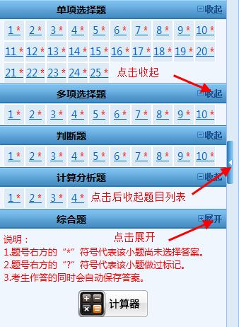 1. 根據(jù)考試科目不同,題目類型分為單項(xiàng)選擇題、多項(xiàng)選擇題、判斷題、計(jì)算分析題、簡答題和綜合題。題號(hào)右方的"*"號(hào)表示該小題還未作答,"?"號(hào)表示該小題做過標(biāo)記??忌梢酝ㄟ^題號(hào)列表查看本考試科目全套試卷的作答情況(包括每道試題的已答或未答狀態(tài)、標(biāo)記狀態(tài)),還可點(diǎn)擊各題號(hào)按鈕,直接進(jìn)入各試題進(jìn)行答題或檢查。