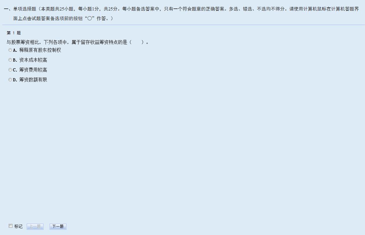 單項(xiàng)選擇題答題時(shí),考生直接用鼠標(biāo)點(diǎn)擊備選項(xiàng)中認(rèn)為正確的選項(xiàng)前的按鈕即可。如需修改答案,用鼠標(biāo)點(diǎn)擊其他備選項(xiàng)前的按鈕,原選擇的選項(xiàng)將被自動(dòng)替換。如需撤銷已經(jīng)選中的選項(xiàng),再次點(diǎn)擊該選項(xiàng)前的按鈕即可。