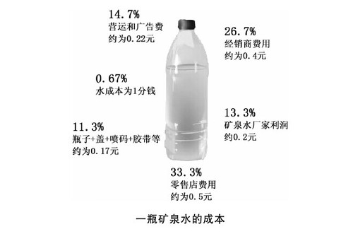 那么一瓶礦泉水的最大成本在哪兒呢?通過數(shù)據(jù)分析不難發(fā)現(xiàn),零售店費用高達33.3%,而次之的是經(jīng)銷商(批發(fā)商)的經(jīng)銷費用26.7%,再接下來是廣告宣傳和營運費用14.7%,作為礦泉水的主要組成部分瓶子、蓋子、包裝約為11.3%,而最主要的水則兒乎不占用任何成本。