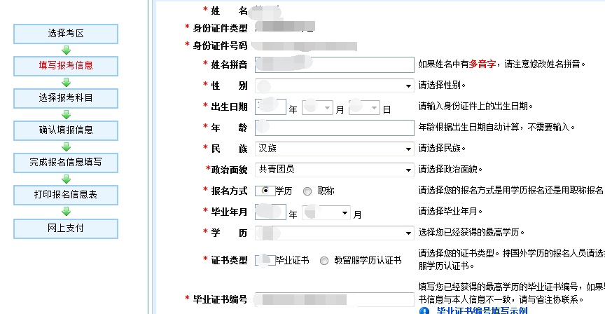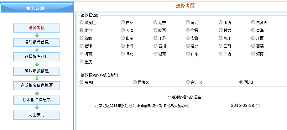 報名流程分為七步,分別為:選擇考區(qū)——填寫報考信息——選擇報考科目——確認(rèn)填報信息——完成報名信息填寫——打印報名信息表——網(wǎng)上支付