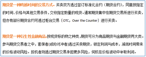 簡單來說,期貨的最大特點從它的名字就能看出來。英文Futures來自future(未來),它的含義是交易雙方可以在約定的未來某一天交收現(xiàn)貨,而不必在買賣初期完成?!捌谪洝迸c“現(xiàn)貨”相對,前者是將來時,后者是現(xiàn)在時。