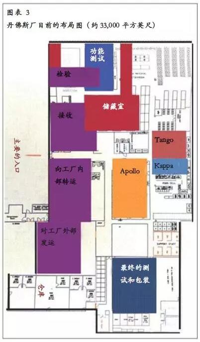 丹佛斯的工作人員覺得,公司管理層對他們的工廠常有前景渺茫之感,工作人員間也籠罩著工廠壽命不可預(yù)測的氣氛。2007年一位新的營運主管Fehrecke博士就任,再一次把重點放在生產(chǎn)和產(chǎn)品設(shè)計的有效性和效率上。Fehrecke訪問了丹佛斯工廠,并指定由管理層組成一個工作小組來研究各種遷移方案。Fehrecke博士宣稱,留在丹佛斯并不可取。丹佛斯的設(shè)施租約即將到期,德爾格公司的管理層并不想要延長這份陳舊的外部設(shè)施租約。從目前經(jīng)營情況來看,丹佛斯并未體現(xiàn)公司所主張的生產(chǎn)效率高、機構(gòu)精簡的經(jīng)營理念。經(jīng)營的現(xiàn)狀反映了90年代后期該行業(yè)產(chǎn)能利用的普遍情況,而不是德爾格公司世界各地的工廠所追求的最先進(jìn)的生產(chǎn)經(jīng)營。因此,毫無疑問,這一任務(wù)組的責(zé)任是要確保,它所提出的建議必須在流程的產(chǎn)能和經(jīng)營的績效方面有顯著的進(jìn)步。衡量新設(shè)施的一項重要標(biāo)準(zhǔn)在于,它必須少投入、多產(chǎn)出。遷離丹佛斯是解決這一問題的途徑之一。從圖表2和圖表3,可以分別看到丹佛斯廠的場地分配和布局的概略情況。