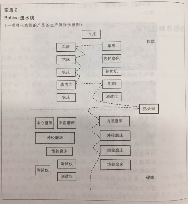 1998年3月Aero Gear開始向精益法過(guò)渡。他們認(rèn)定了三條價(jià)值流 ,并在每一條價(jià)值流中建立了若干個(gè)生產(chǎn)單元。Aero Gear大部分的齒輪和齒輪軸,是由“Bohica”和“Blue”這兩個(gè)價(jià)值流所生產(chǎn)的。它們的機(jī)械和加工過(guò)程的性質(zhì)決定了,Bohica和Blue這兩條價(jià)值流上的各個(gè)生產(chǎn)單元都按“流水法”組織(單元的中間有一條走道,機(jī)器都排列在走道的兩側(cè),各個(gè)機(jī)工就在走道兩側(cè)操作機(jī)器),而不是一般所采用的機(jī)器按照U字形排列的布局。Bohica價(jià)值流生產(chǎn)相對(duì)簡(jiǎn)單的零件,如:正齒輪、泵齒輪和離合器。Blue價(jià)值流生產(chǎn)螺旋傘齒輪等需要更多的機(jī)加工的復(fù)雜齒輪。各條價(jià)值流都劃分成“軟”“硬”兩個(gè)端點(diǎn),它們被看作價(jià)值流內(nèi)部分開的兩個(gè)生產(chǎn)單元。在完成了“軟端點(diǎn)”的生產(chǎn)后,被加工的零件要經(jīng)過(guò)熱處理淬火;然后再?gòu)臒崽幚砘氐健坝捕恕?,做最終的加工。Bohica價(jià)值流的布局,見圖表2。