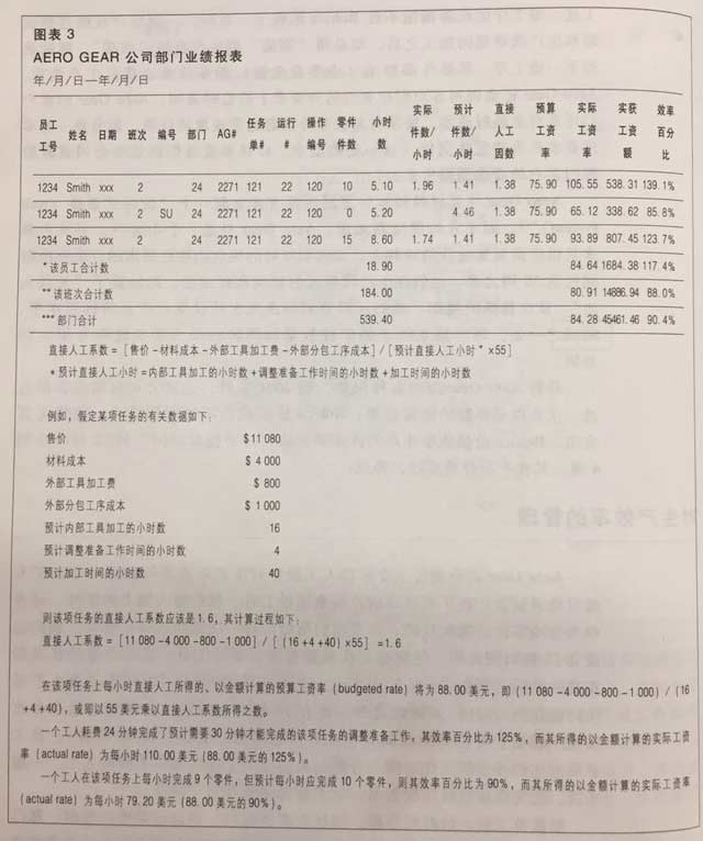 根據(jù)員工輸入的時(shí)間數(shù)據(jù),編制出兩種報(bào)表,用以監(jiān)督生產(chǎn)效率:部門業(yè)績(jī)報(bào)表和工時(shí)匯總報(bào)表。部門業(yè)績(jī)報(bào)表為詳細(xì)列示各項(xiàng)直接人工活動(dòng)的清單,并按員工、班次和部門加以匯總。這種報(bào)表按日和周編制。報(bào)表的格式,如圖表3所示。在這份報(bào)表上,有兩項(xiàng)需要特別注意:直接人工系數(shù)和效率百分比。