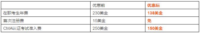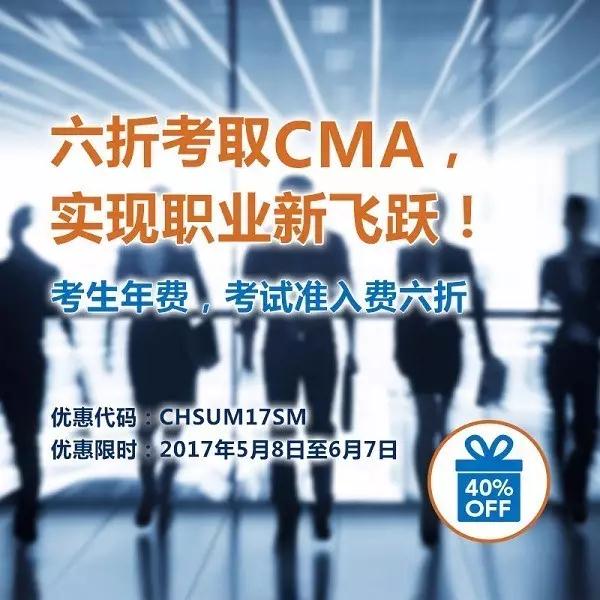 2017年5月8日至6月7日,在職考生年費(fèi)6折,CMA認(rèn)證考試準(zhǔn)入費(fèi)6折,免除首次注冊費(fèi)15美金,共節(jié)省207美金,折后共288美金。折扣代碼為:CHSUM1752