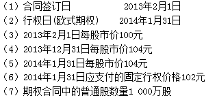 【例題】甲公司于2013年2月1日向乙公司發(fā)行以自身普通股為標(biāo)的的看漲期權(quán)。根據(jù)該期權(quán)合同,如果乙公司行權(quán)(行權(quán)價(jià)為102元),乙公司有權(quán)以每股102元的價(jià)格從甲公司購(gòu)入普通股1 000萬(wàn)股。其他有關(guān)資料如下:
