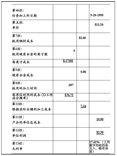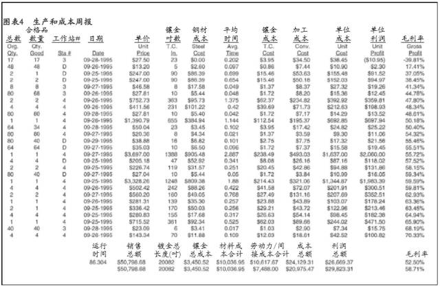 圖表4是生產(chǎn)與成本周報(bào),依據(jù)這一報(bào)告再進(jìn)行分析。它包含了各項(xiàng)定貨的成本構(gòu)成。請注意:這種成本構(gòu)成很簡明,并累計(jì)出毛利率的數(shù)字。如前所述,這一比率是用來說明各項(xiàng)定貨每周所負(fù)的經(jīng)濟(jì)責(zé)任,形成一項(xiàng)盈利的底線。下面用第2行這一項(xiàng)定貨的數(shù)據(jù)來說明該圖表的內(nèi)容。
