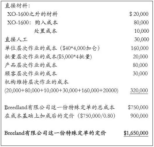 Josh對該項目的定價決策。星期一的一早,George來到Abby的辦公室,把周末與Josh對這個項目的進展的情況告訴了她。他說明Josh有意購買剩余的10加侖XO-1600。George指出,這項協(xié)議的細節(jié)將在本周內(nèi)商定。Abby稍為停頓了一下,尋思此事的細節(jié),她想起了上周五她在把該項目開價的事告訴George時,曾提及那剩余未用的10加侖將被棄臵,因而對該定單所開的價格將包括購買XO-1600的全部價值再加上強制性棄臵所需要的費用。Abby建議說,給Breeland公司的報價,不妨稍為推遲一些;如果Breeland同意推遲,則協(xié)議草稿可以等到Josh的定單確定下來后作一修改。
