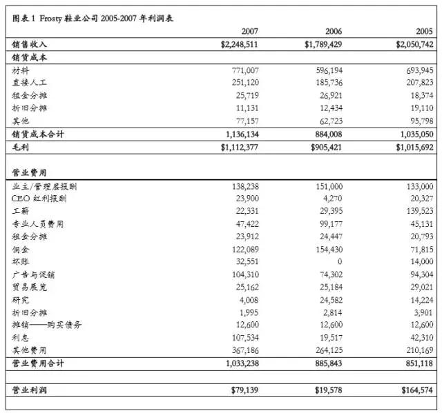 在2004年,F(xiàn)rosty鞋業(yè)公司的銷售額和稅前利潤分別為$2,500萬和$264,000;但在2005年,銷售額和稅前利潤分別下降到$2,100萬和$165,000。下降的原因,是2001年911事件之后整個市場趨于衰退的結果。在2006年,一家大客戶沒有按常規(guī)下達訂單,致使公司的銷售額降到$180萬,稅前利潤降到$20,000。2007年,失去的訂單有所復原,銷售額和稅前利潤分別回升到$220萬和$79,000。近年以來,由于在廣告、營銷、設計和產(chǎn)品開發(fā)方面需要大量的開支,公司的盈利情況也隨著獲得營運資本的難易程度而變化。在2007年,公司獲得了$200,000的短期信貸限額和$425,000的長期銀行貸款,也運用了這些信用和貸款。圖表1和圖表2列示了實際利潤表和資產(chǎn)負債表。