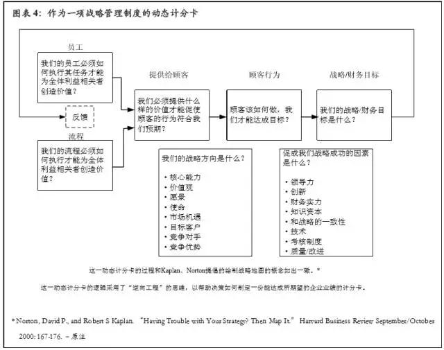 圖表3和4列出了在執(zhí)行“歐文許諾”中提高其經(jīng)濟利潤(economic profit, EP)的關鍵性驅動指標。圖表3采用“逆向工程”的概念,以所期望的企業(yè)業(yè)績?yōu)槌霭l(fā)點,逆向描繪了顧客的什么行為是企業(yè)所期望的,以及顧客的消費體驗是如何影響顧客行為的。顧客的消費體驗又是公司員工的行為、業(yè)務流程以及所提供的產(chǎn)品/服務所造成的。歐文公司想要找到這樣一些指標:能夠促使其一線員工的行為給客戶帶來一流的消費體驗。圖表4則描繪了一般的動態(tài)記分卡上,在員工、業(yè)務流程和產(chǎn)品/服務之間的聯(lián)結關系。這種關聯(lián)帶來顧客的消費體驗,進而會引導顧客的消費行為、給企業(yè)帶來業(yè)績成果。