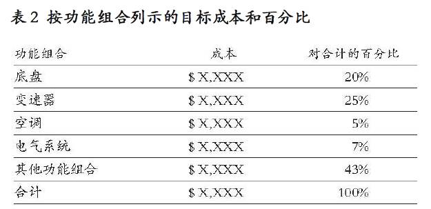 為了對(duì)各項(xiàng)資源的成本有一個(gè)更好的了解,要明確有哪些功能組,以及各功能組的目標(biāo)成本估計(jì)數(shù)。(梅賽德斯也組織了稱為“功能小組”的工作組,其任務(wù)是制訂詳細(xì)的技術(shù)規(guī)范和成本預(yù)測(cè)。)表2列示了計(jì)算得出的各功能組的目標(biāo)成本的相對(duì)百分比 。