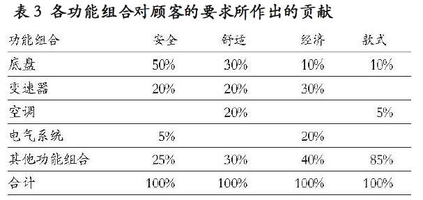 表1列示了潛在顧客對(duì)車子的特性提出的要求;表3則概括了各個(gè)功能組對(duì)于滿足各特性所作的貢獻(xiàn)程度。比方說(shuō),潛在顧客認(rèn)為,安全是AAV的一項(xiàng)重要特性。有的功能組在安全方面能作出的貢獻(xiàn),要比別的功能組大。例如,梅賽德斯的工程師認(rèn)為,底盤的質(zhì)量是安全的一項(xiàng)重要因素(占各功能組在安全方面所作貢獻(xiàn)總和的50%)。