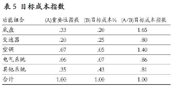 表5所示的“目標(biāo)成本指數(shù)”,是以各功能組的“重要性指數(shù)”除以“目標(biāo)成本百分比”計(jì)算出來(lái)的。梅賽德斯的經(jīng)理人員在概念設(shè)計(jì)階段,運(yùn)用這些指數(shù)(指的是目標(biāo)成本指數(shù)--譯者注)來(lái)了解一項(xiàng)功能組的重要性與該項(xiàng)功能組的目標(biāo)成本之間的關(guān)系。指數(shù)小于1,可能就意味著該功能組的成本,超過(guò)了它的感知價(jià)值。這樣,在產(chǎn)品開發(fā)的早期階段就可以發(fā)現(xiàn)一些在滿足顧客需求前提下的降低成本的機(jī)會(huì),進(jìn)而付諸行動(dòng)。在項(xiàng)目實(shí)施階段做出的選擇,通常到了生產(chǎn)階段就不可逆轉(zhuǎn)了,因?yàn)锳AV的生產(chǎn)成本中,大約80%屬于材料和外部供應(yīng)商提供的系統(tǒng)組件。