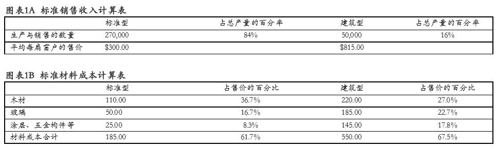 1.上面這份預(yù)計的工廠利潤表,采用該工廠的標(biāo)準(zhǔn)成本與標(biāo)準(zhǔn)銷售收入算出。其詳細(xì)數(shù)字見下列的圖表1B到圖表1H;假定的生產(chǎn)量為270,000扇標(biāo)準(zhǔn)型窗戶和50,000扇建筑型窗戶(參見圖表1A)。