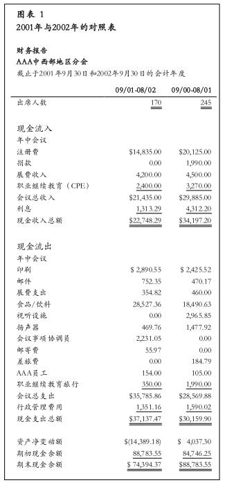在2002年8月AAA-MW督導委員會的會議上,委員會得知2002年春季的地區(qū)會議虧損了14,389.13美元。圖表1列示了2001年與2002年的對比情況。2002年AAA-MW的地區(qū)性會議是3月份在密爾沃基舉行的,出席人數(shù)為170人。出席人數(shù)比前一年在圣路易斯舉行的會議驟降了30.6%,這是最近幾年的歷史上,出席人數(shù)少于200人的不多的幾次之一。委員會認為,出席人數(shù)低的主要原因是人們不愿意乘坐飛機(旅行),因為此時911恐怖襲擊剛發(fā)生不久。此外,委員會還認為會議的地址(威斯康星州的密爾沃基市)在早春時節(jié)旅行不便、不具吸引力。因此,委員會信服了2002年的會議出現(xiàn)現(xiàn)金凈流出是個反?,F(xiàn)象,不需要做調(diào)查研究。于是,委員會接著開始討論明年春季將在圣路易士市的千禧大酒店(Millennium Hotel)召開的2003年AAA-MW年會。中西部地區(qū)分會通常都是每隔一年便在圣路易士市召開一次年會,因為該市處在中心位置、春季氣候宜人,參加的人總是特別多。為此,委員會并不擔心2003年的會議會出現(xiàn)虧損的結(jié)果。