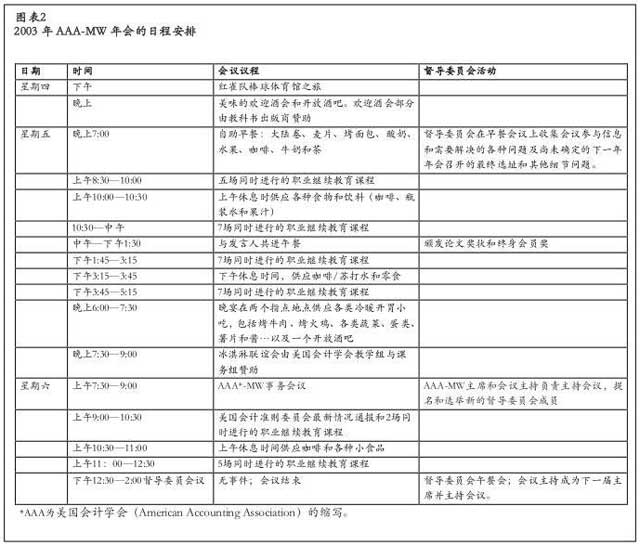 2003年3月,AAA-MW會議按為期兩天半的慣例安排進行,與會者參加了幾個包括在注冊費中的職業(yè)繼續(xù)教育講習會和一些其他的活動。圖表2列示了2003年AAA-MW年會的日程安排。