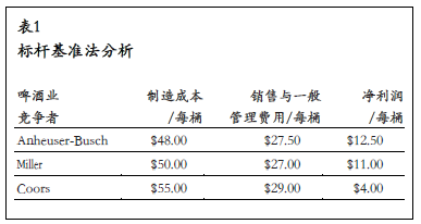 Coors 公司還沒有決定參與商業(yè)化的標(biāo)桿基準(zhǔn)數(shù)據(jù)庫,因而能取得的標(biāo)桿基準(zhǔn)信息為數(shù)有限。(在美國,最大的標(biāo)桿基準(zhǔn)數(shù)據(jù)庫當(dāng)推美國注冊會計師協(xié)會(AICPA)所贊助的Hackett Group Study,約有700家公司參與。)從年度報告取得的下列財務(wù)信息中,可以看到Coors公司跟它的兩個主要競爭對手之間的業(yè)績差距:
