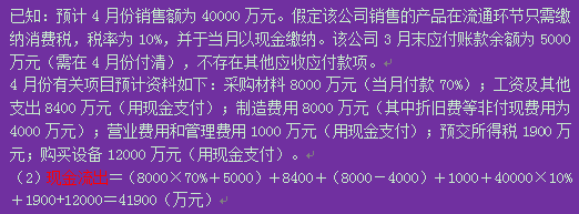 【例題?計(jì)算題】已知:某公司2017年第1~3月實(shí)際銷售額分別為38000萬元、36000萬元和41000萬元,預(yù)計(jì)4月份銷售額為40000萬元。每月銷售收入中有70%能于當(dāng)月收現(xiàn),20%于次月收現(xiàn),10%于第三個(gè)月收訖,不存在壞賬。假定該公司銷售的產(chǎn)品在流通環(huán)節(jié)只需繳納消費(fèi)稅,稅率為10%,并于當(dāng)月以現(xiàn)金繳納。該公司3月末現(xiàn)金余額為80萬元,應(yīng)付賬款余額為5000萬元(需在4月份付清),不存在其他應(yīng)收應(yīng)付款項(xiàng)。