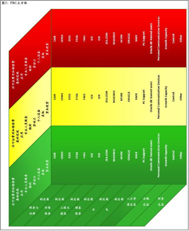 最后,教授們編出了可以呈交的第3階段的流程成熟模式,遞給Wanyonyi。它包括幾個主要的文件,幫助TS的經(jīng)理人員重溫教授們在車隊對PBC所作的分析。教授們編制了一份“PBC立方體”的圖式,這個圖把成本分配系統(tǒng)加以分類和歸納。在立方體的左側(cè),列示了各個業(yè)務(wù)單位;在立方體的前方,列示了提供的服務(wù)(或應(yīng)用);在立方體的頂部,列示了成本的類別/資源。立方體中的交叉部分,實際上都記入到一份龐大的電子表格(Excell),在表格中把整個TS的預(yù)算,分解到JEA公司的所有單位。教授們準備召開最后一次會議,跟Wanyonyi和JEA公司參與到這個項目中來的主任們討論報告書。