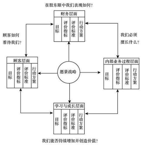 平衡計(jì)分卡的理論基礎(chǔ)是:利潤(rùn)最大化是短期的,企業(yè)應(yīng)體現(xiàn)戰(zhàn)略目標(biāo),致力于追求未來(lái)的核心競(jìng)爭(zhēng)力。一個(gè)完整的平衡計(jì)分卡將對(duì)企業(yè)的業(yè)績(jī)?cè)u(píng)價(jià)分成四類指標(biāo):財(cái)務(wù)效益指標(biāo)、內(nèi)部經(jīng)營(yíng)管理指標(biāo)、外部指標(biāo)、技術(shù)創(chuàng)新和學(xué)習(xí)指標(biāo)。