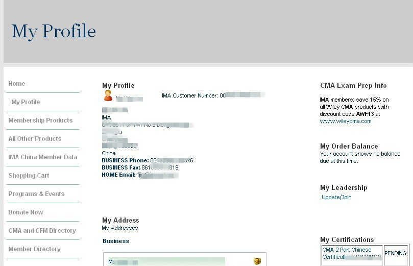 8. 點擊My Profile 之后就會進入個人信息界面,這個界面會看到您的會員號 ( IMA Customer Number)請把鼠標的指針移動到左邊的My Profile字樣處,會自動彈出一個可選框。點擊第六個Tran information您的成績就會出現(xiàn)了。