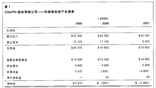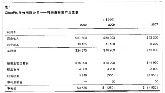 ClearPix 股份有限公司是一家位于德克薩斯州的新創(chuàng)立的高新技術企業(yè)。這家公司在2003年年初設立。公司管理層計劃2O06年上市。但是2000一2001年高新技術公司股票崩潰的影響一直揮之不去,管理層不得不推遲了該項計劃。從2007~2009年,隨著公司使用新的渦輪生產線,公司業(yè)務有大幅度的增長,在這期間銷售額增長了63%,2009年賬上有了利潤。