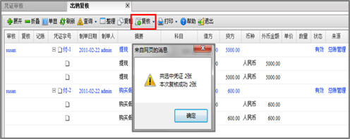 由出納對含有現(xiàn)金或銀行存款科目的憑證進行復核(非必須);出納復核認為錯誤或有異議的憑證,應交與制單員修改后再復核。單張復核、批量復核、
