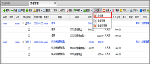 記賬后的憑證不能進(jìn)行修改、刪除、審核操作,如果要這么操作,則須先反記賬,反記賬操作可在“憑證管理”里進(jìn)行;