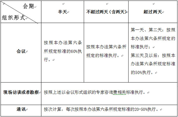 第九條 不同形式組織的專家咨詢活動(dòng)適用專家咨詢費(fèi)標(biāo)準(zhǔn)如下: