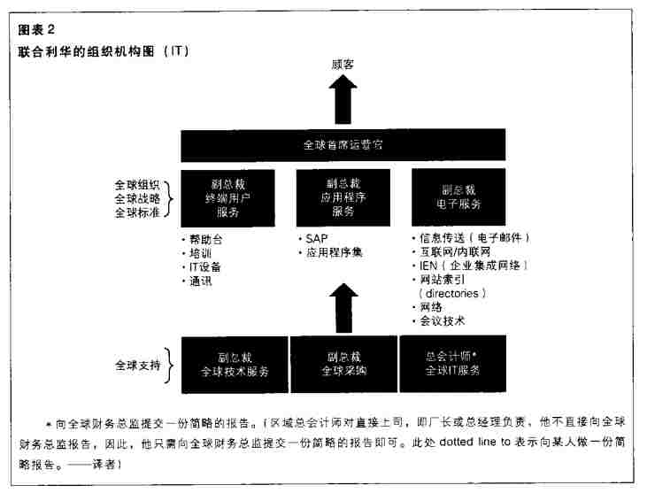聯(lián)合利華的戰(zhàn)略為:管理技術(shù)部署來幫助業(yè)務(wù)目標(biāo)的實(shí)現(xiàn)。IT部門為企業(yè)提供建議、幫助和領(lǐng)導(dǎo)能力,盡量提高來自產(chǎn)品和服務(wù)的收益。對(duì)公司其他部門來說,財(cái)務(wù)團(tuán)隊(duì)與IT部門相互合作,成為一個(gè)整體。(圖表2為全球IT部門的結(jié)構(gòu)圖。)財(cái)務(wù)部門與IT一起工作,建立開發(fā)商合作資源、管理外部供應(yīng)商。此外,財(cái)務(wù)團(tuán)隊(duì)的另一重要作用就是洽談合同,進(jìn)而不斷改進(jìn)從風(fēng)險(xiǎn)管理到網(wǎng)絡(luò)基礎(chǔ)設(shè)施的所有方面。財(cái)務(wù)團(tuán)體也設(shè)計(jì)信息管理結(jié)構(gòu)、制定采購(gòu)政策、并分析提供服務(wù)的第三方供應(yīng)商的財(cái)務(wù)狀況。