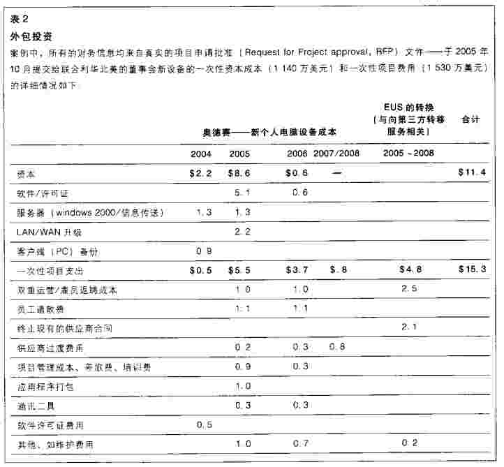 表3概括了外包協(xié)議所帶來(lái)的預(yù)期節(jié)省。這種節(jié)約模式將第三方供應(yīng)商對(duì)“每個(gè)席位”或“每臺(tái)個(gè)人電腦”的定價(jià)與聯(lián)合利華現(xiàn)有終端用戶(hù)服務(wù)(EUS)的服務(wù)模式成本進(jìn)行對(duì)比。與聯(lián)合利華當(dāng)前的營(yíng)運(yùn)成本對(duì)比,預(yù)計(jì)每年將節(jié)約1 260萬(wàn)美元。