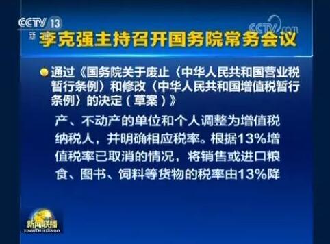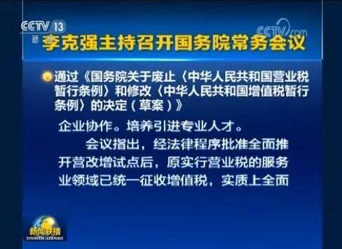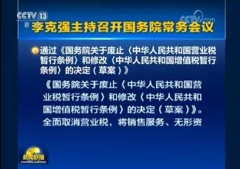 國務院總理李克強10月30日主持召開國務院常務會議,通過《國務院關于廢止〈中華人民共和國營業(yè)稅暫行條例〉和修改〈中華人民共和國增值稅暫行條例〉的決定(草案)》,推動營改增改革成果法治化。