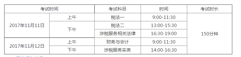2017年稅務師考試將于11月11日-12日舉行,一共為五科,每科為150分鐘。具體如下: