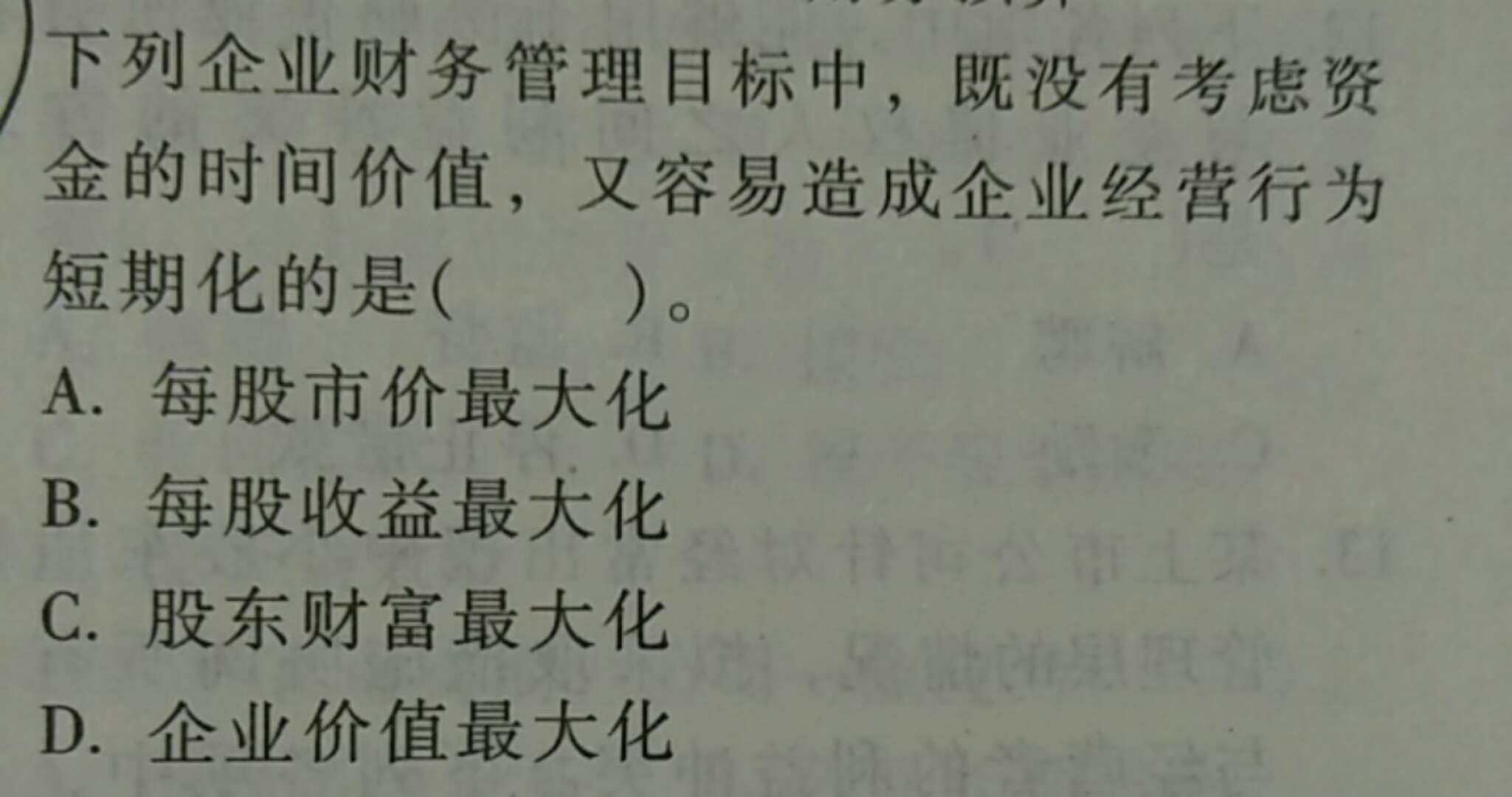 1.下列各項(xiàng)企業(yè)財(cái)務(wù)管理目標(biāo)中,既沒有考慮資金的時(shí)間價(jià)值、也沒有考慮投資風(fēng)險(xiǎn)的是( )。