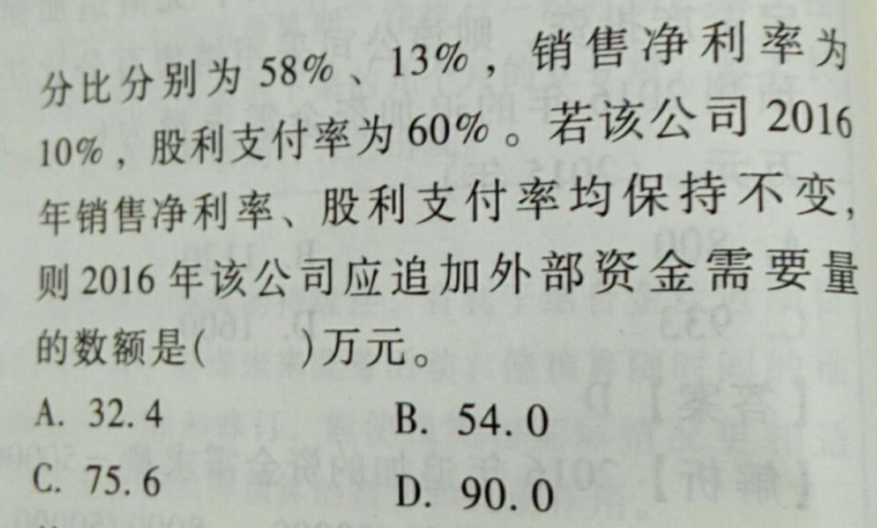 【解析】本題考查的知識(shí)點(diǎn)是運(yùn)用銷售百分比法計(jì)算外部融資額。外部融資需求量=2000×20%×(59%-14%)-2000×(1+20%)×10%×(1-60%)=84(萬元),所以選項(xiàng)C正確。參考教材P28。