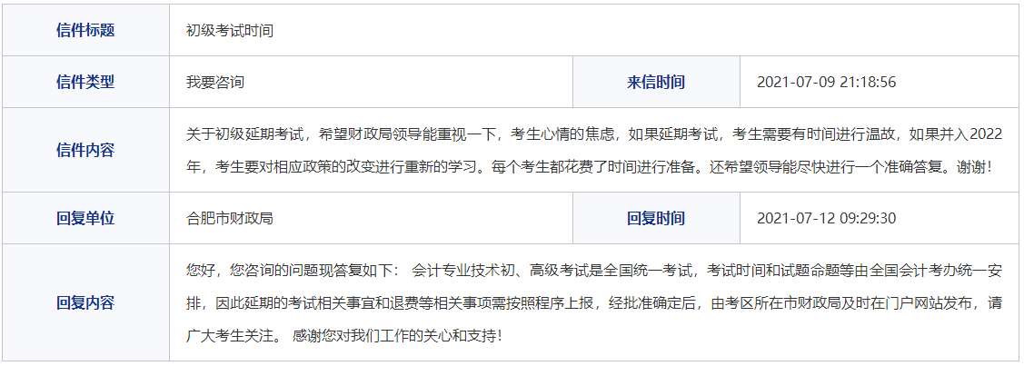 有安徽合肥的考生詢問:2021年初級會計考試延期了,什么時候會再考?合肥市財政局回復了以下內(nèi)容,一起來看!
