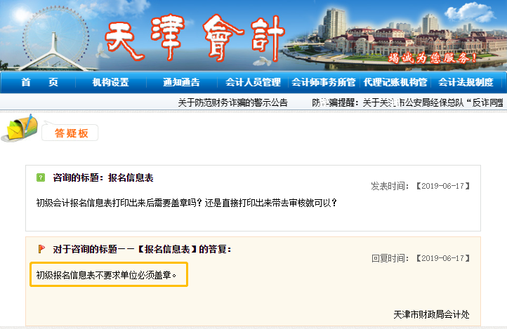對于報名信息表是否需要提供單位公章,各地的要求不同,如下圖,天津會計網(wǎng)答疑版中指出,考生審核時提供的初級會計報名信息表不要求單位必須蓋章。