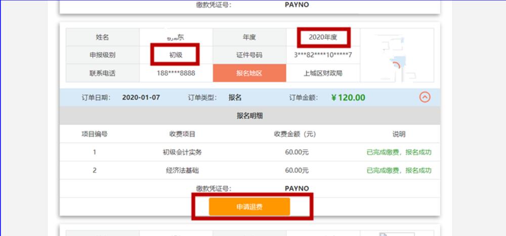 3、網(wǎng)頁(yè)中將跳出報(bào)名訂單,找到您的2020年會(huì)計(jì)初級(jí)資格考試報(bào)名信息,點(diǎn)擊下方的“申請(qǐng)退費(fèi)”按鈕。