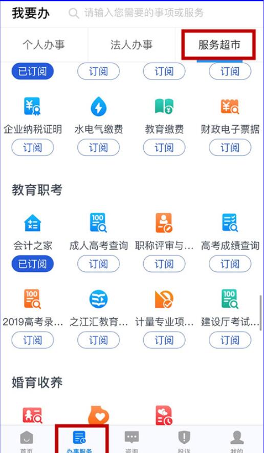 二、手機(jī)端操作指南:1、請(qǐng)登錄“浙里辦”手機(jī)APP——選擇“辦事服務(wù)”——選擇“服務(wù)超市”——選擇“教育職考”欄目下的“會(huì)計(jì)之家”。